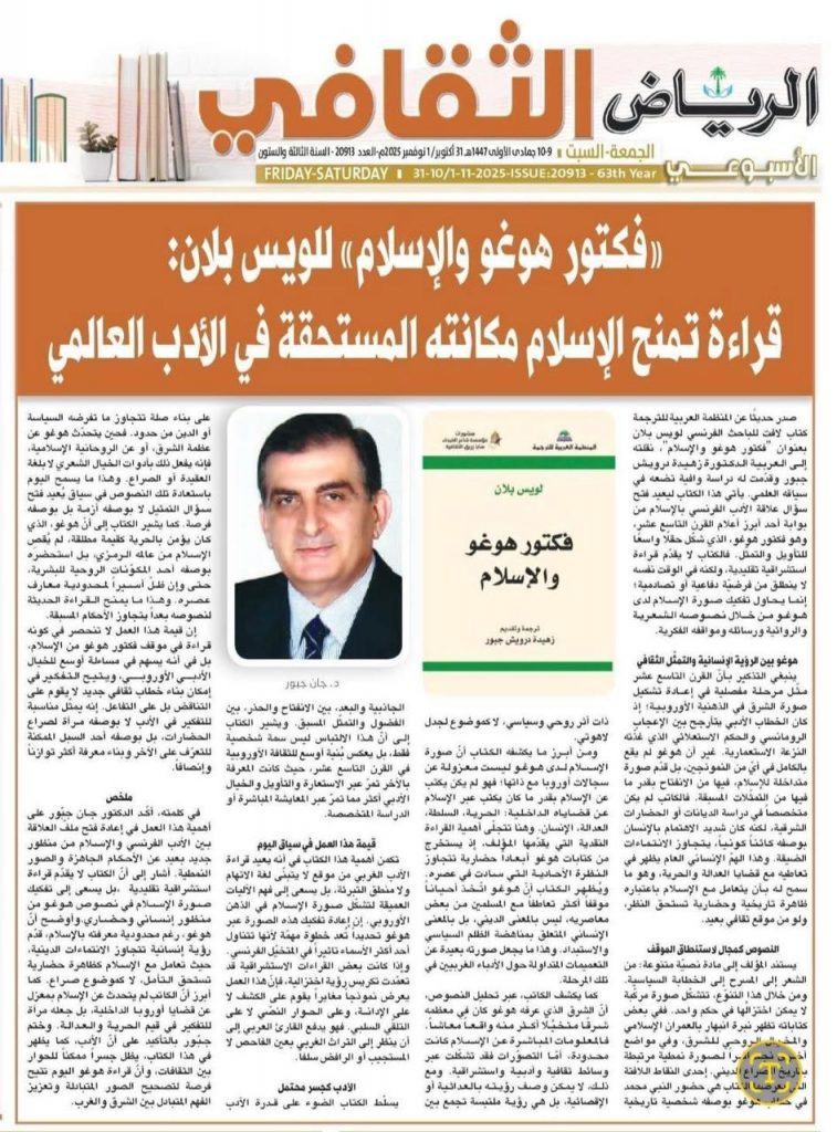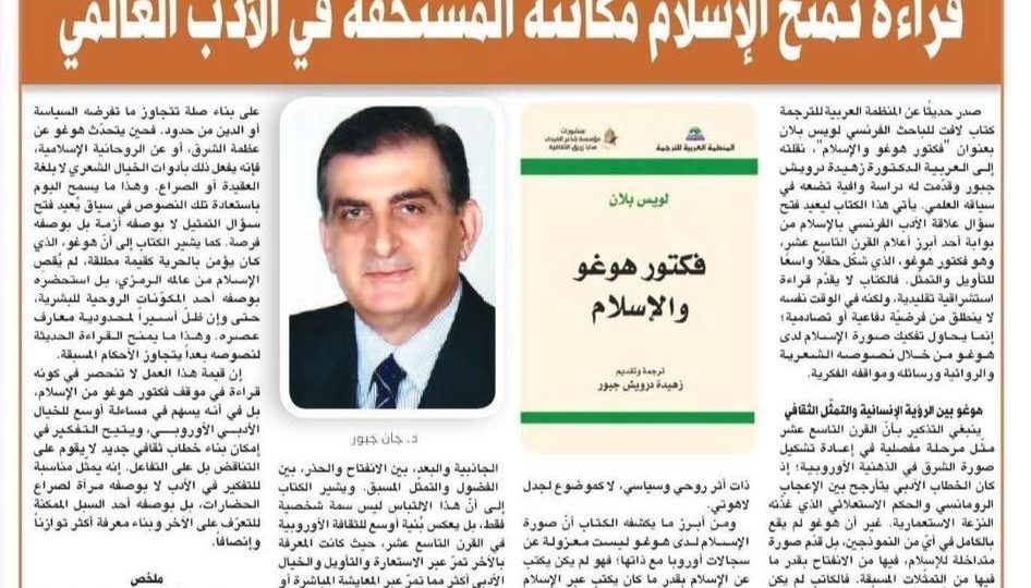 صدر حديثًا عن المنظمة العربية للترجمة كتاب لافت للباحث الفرنسي لويس بلان بعنوان “فكتور هوغو والإسلام”، نقلته إلى العربية الدكتورة زهيدة درويش جبور وقدّمت له دراسة وافية تضعه في سياقه العلمي. يأتي هذا الكتاب ليعيد فتح سؤال علاقة الأدب الفرنسي بالإسلام من بوابة أحد أبرز أعلام القرن التاسع عشر، وهو فكتور هوغو، الذي شكّل حقلًا واسعًا للتأويل والتمثّل. فالكتاب لا يقدّم قراءة استشراقية تقليدية، ولكنه في الوقت نفسه لا ينطلق من فرضيّة دفاعية أو تصادمية؛ إنما يحاول تفكيك صورة الإسلام لدى هوغو من خلال نصوصه الشعرية والروائية ورسائله ومواقفه الفكرية.
