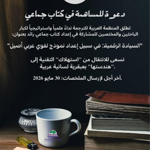 السيادة الرقميةفي سبيلإعداد نموذج لغوي عربي أصيل السيادة الرقميةفي سبيلإعداد نموذج لغوي عربي أصيلنداء املنظمة العربية للترجمة:انطالقا ً من مبدأ أن التطوراتالتي تشهدها العالقة بين اإلنسان والذكاء االصطناعيمعقدةومتسارعة، وإيمانًا بأنمصيراإلنسان ومستقبلهال يمكن اإلحاطة بهماإال من خالل تالقح األفكار وتعدد املقاربات،تطلقاملنظمة العربية للترجمةهذاالنداء للمشاركة في إعدادكتاب جماعييهدفإلىأن يكونًمرجعا ً علميا ً استراتيجيايؤسس ملرحلة جديدة في دراساتالتفاعل […]